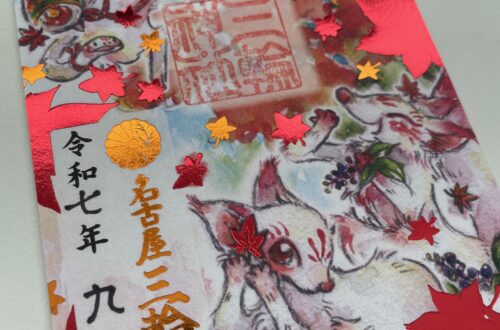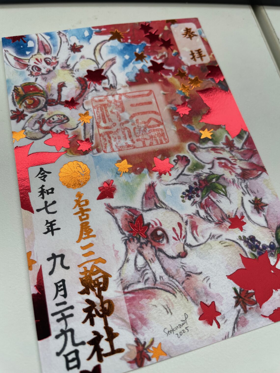 2025年9月29日から配布される、名古屋三輪神社のスペシャル御朱印ですー。SP:名古屋三輪神社CL:村田金箔グループIL:むらかみしのD・AD・CD:MARU-C 昌子衛 深まる秋の紅葉を2色の箔で表現しました♪ぜひ名…